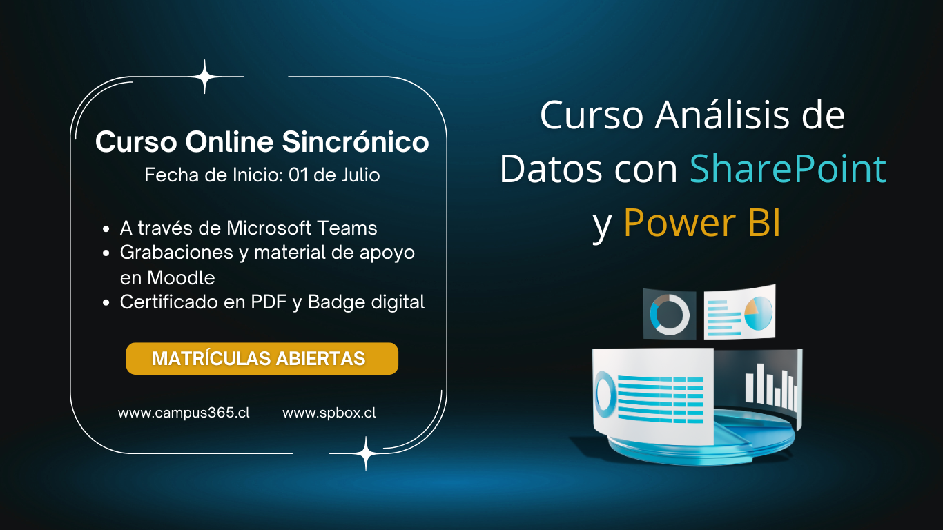 Campus 365 y SPBox informan que este martes 01 de julio inicia oficialmente el curso “Análisis de Datos con SharePoint y Power BI”, en modalidad online y en vivo, con sesiones los martes y jueves de 19:00 a 22:00 hrs (Chile).